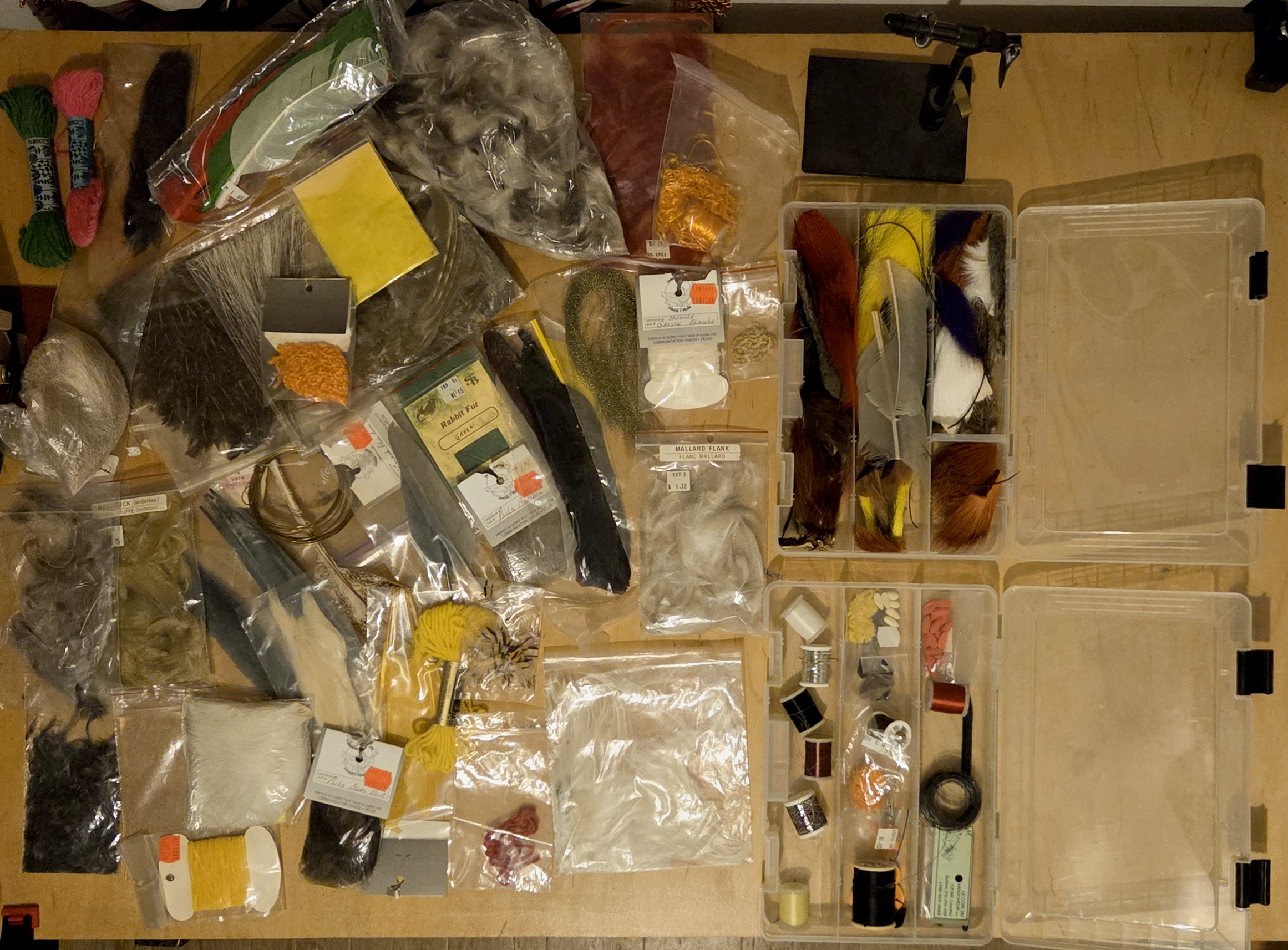 Je vends un kits complet pour faire des mouches à pêche. Ya du stock en maudit, j’ai acheté ça vla quelques années à un vieux monsieur qui a fait ça pendant toute sa vie mais je n’aurais jamais le temps de m’y mettre finalement.